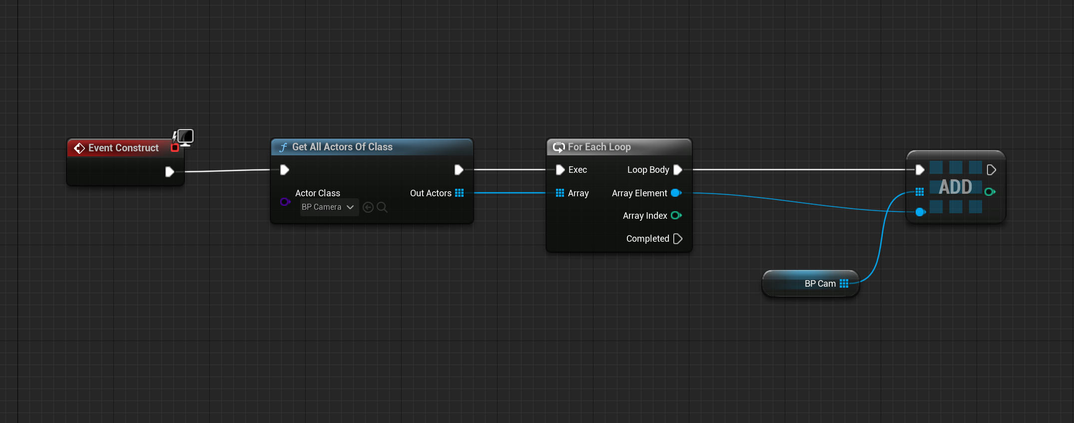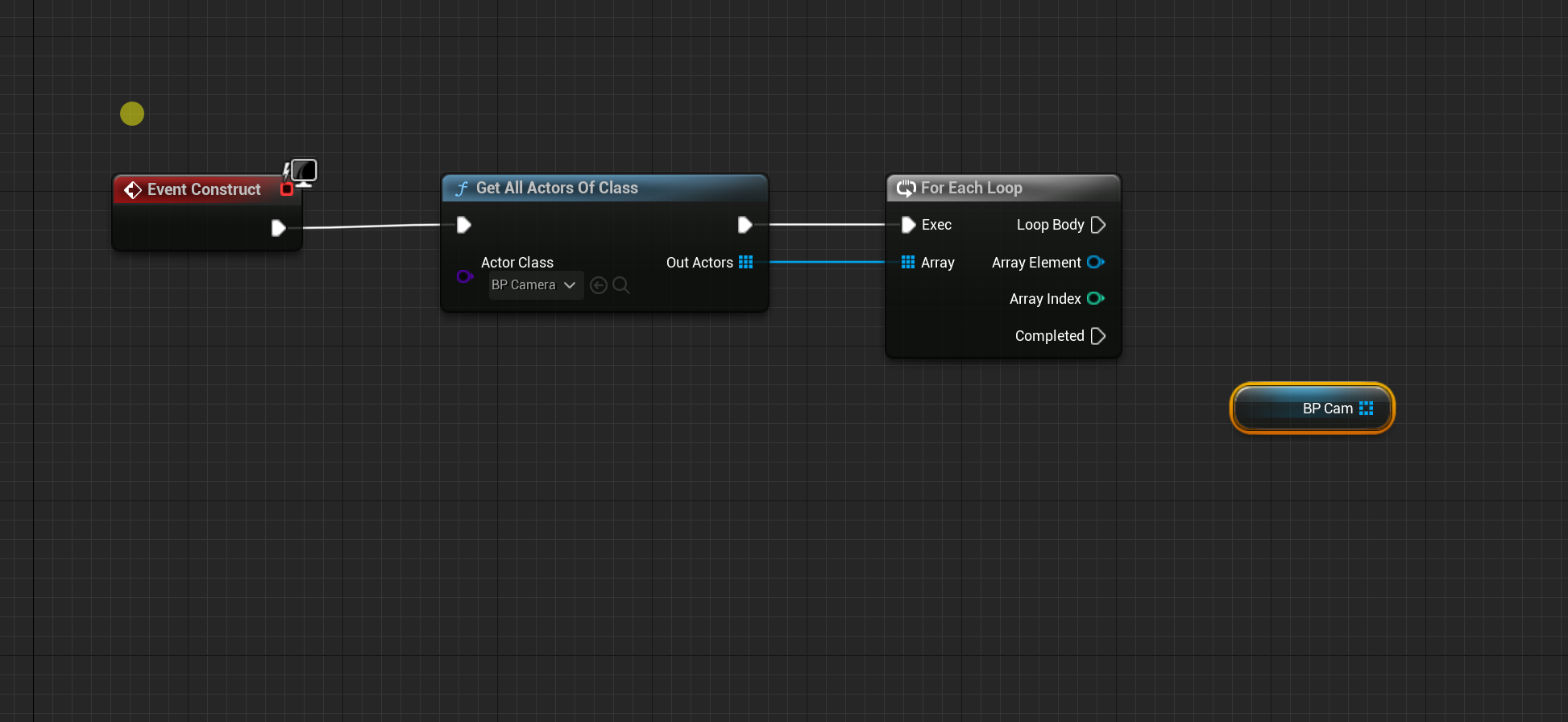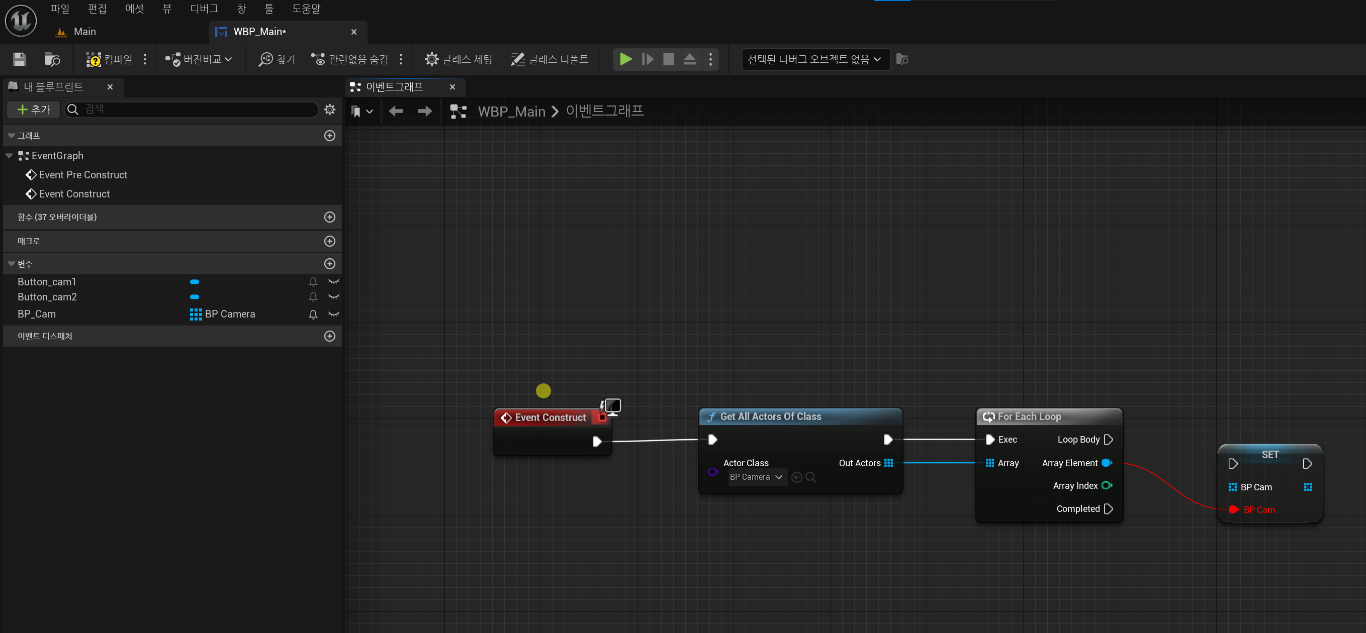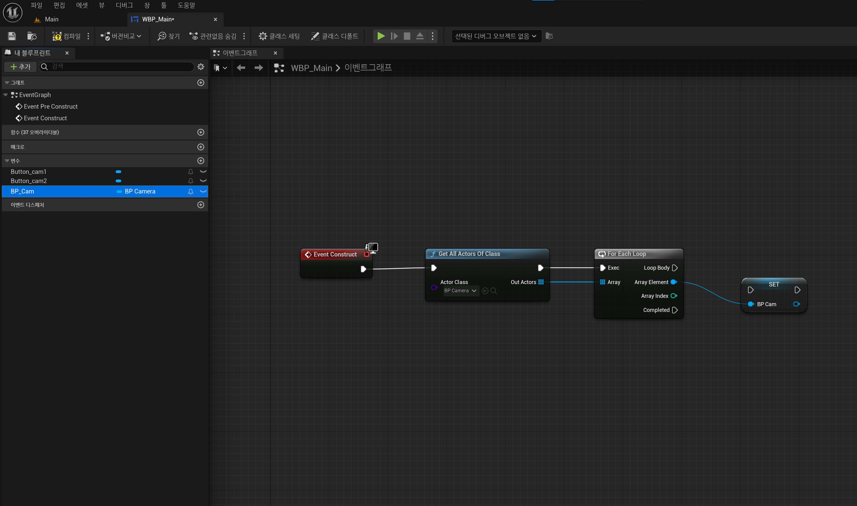 지금까지 WBP_Main 블루프린트에 레벨에 배치된 모든 BP_Cam 배열 변수에 저장하는 방법에 대해 설명했습니다.