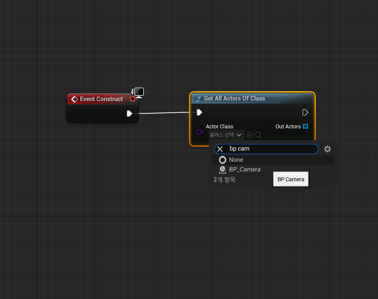 그다음 클래스 선택 > BP_Camera를 검색해 클릭합니다.