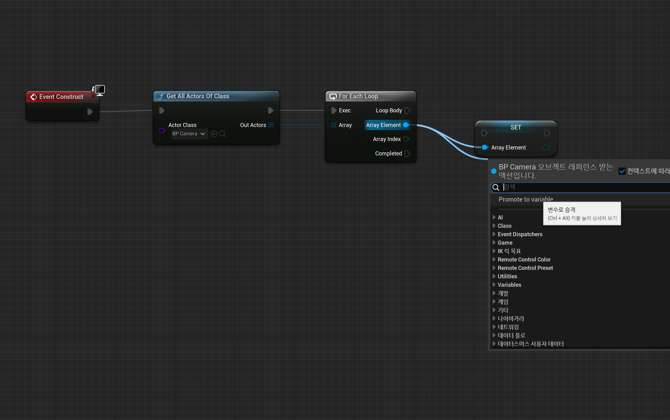 그리고 Array Element를 드래그 앤 드롭해 변수로 승격을 클릭합니다. 변수 이름을 BP_Cam으로 변경합니다.