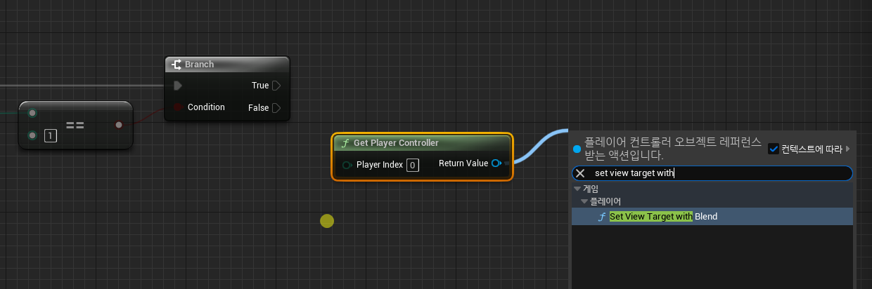 그다음 get plaery controller를 찾아 클릭 후 해당 노드를 드래그 앤 드롭해 set view target with blend를 클릭합니다.