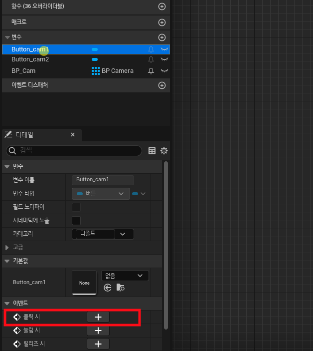 그다음 Button_cam1을 클릭한 후 왼쪽 아래에 보이는 클릭 시 + 버튼을 눌러 노드를 생성합니다.