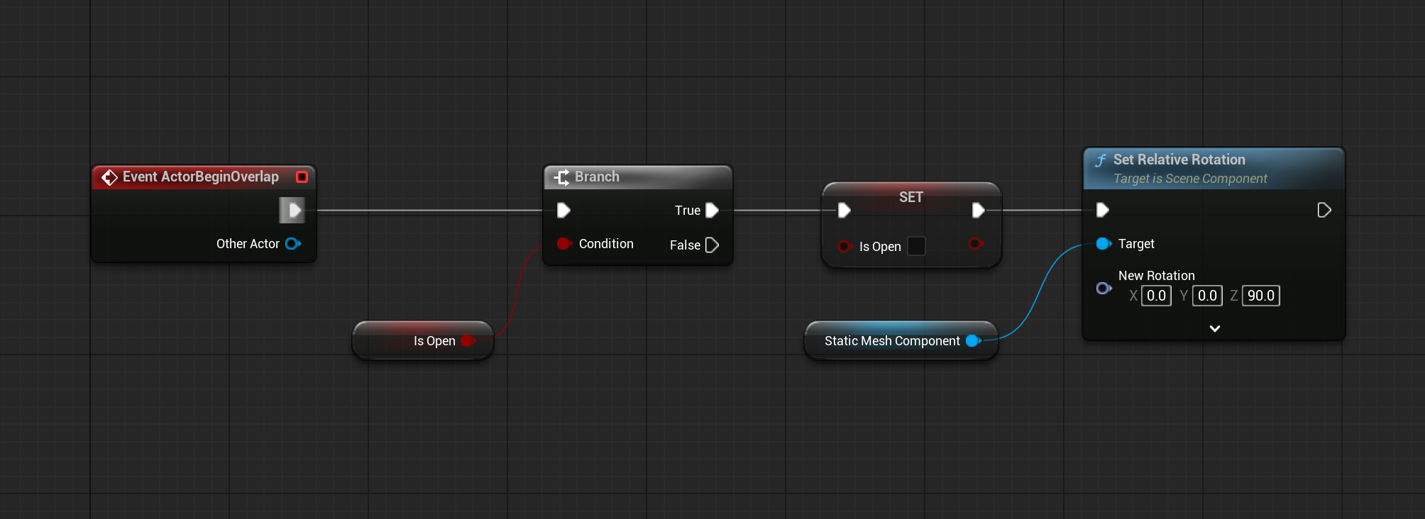 - Set Relative Rotation 노드를 사용하여 문 회전 (예: Z축으로 90도)