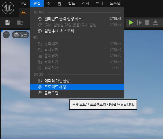 왼쪽 위에 편집 탭을 눌러 프로젝트 세팅을 클릭해 봅시다.