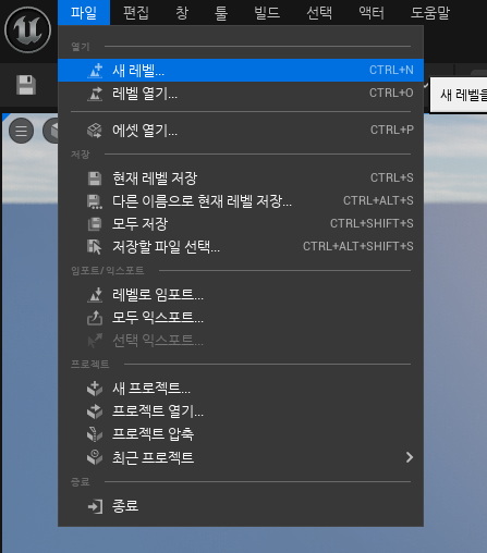 왼쪽 위에 보시면 파일 탭을 눌러 새 레벨을 눌러봅시다.