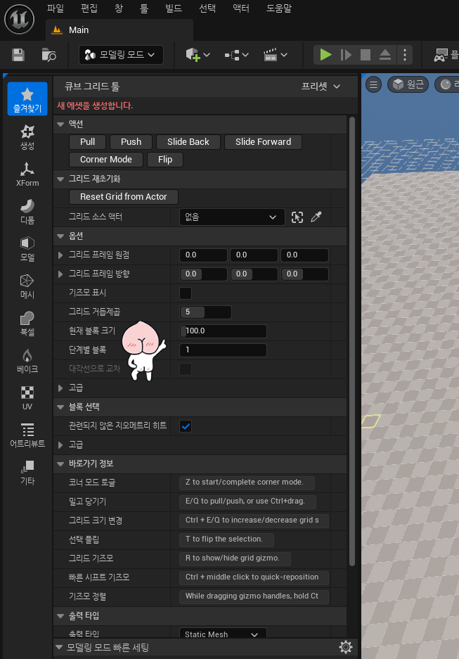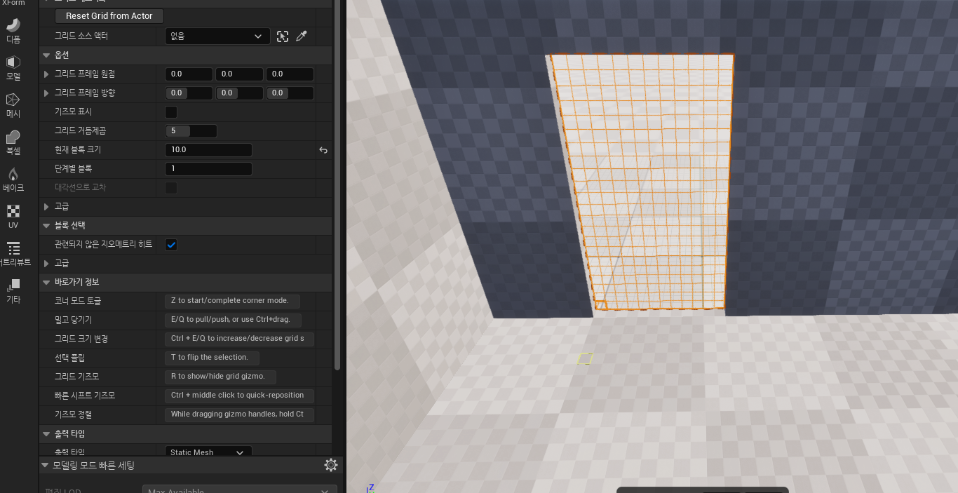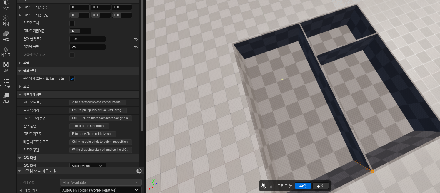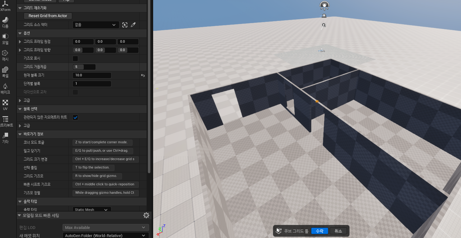 모델링 모드에서 'CubeGrid'를 활용해 인테리어 내벽 및 주방을 제작할 예정입니다.