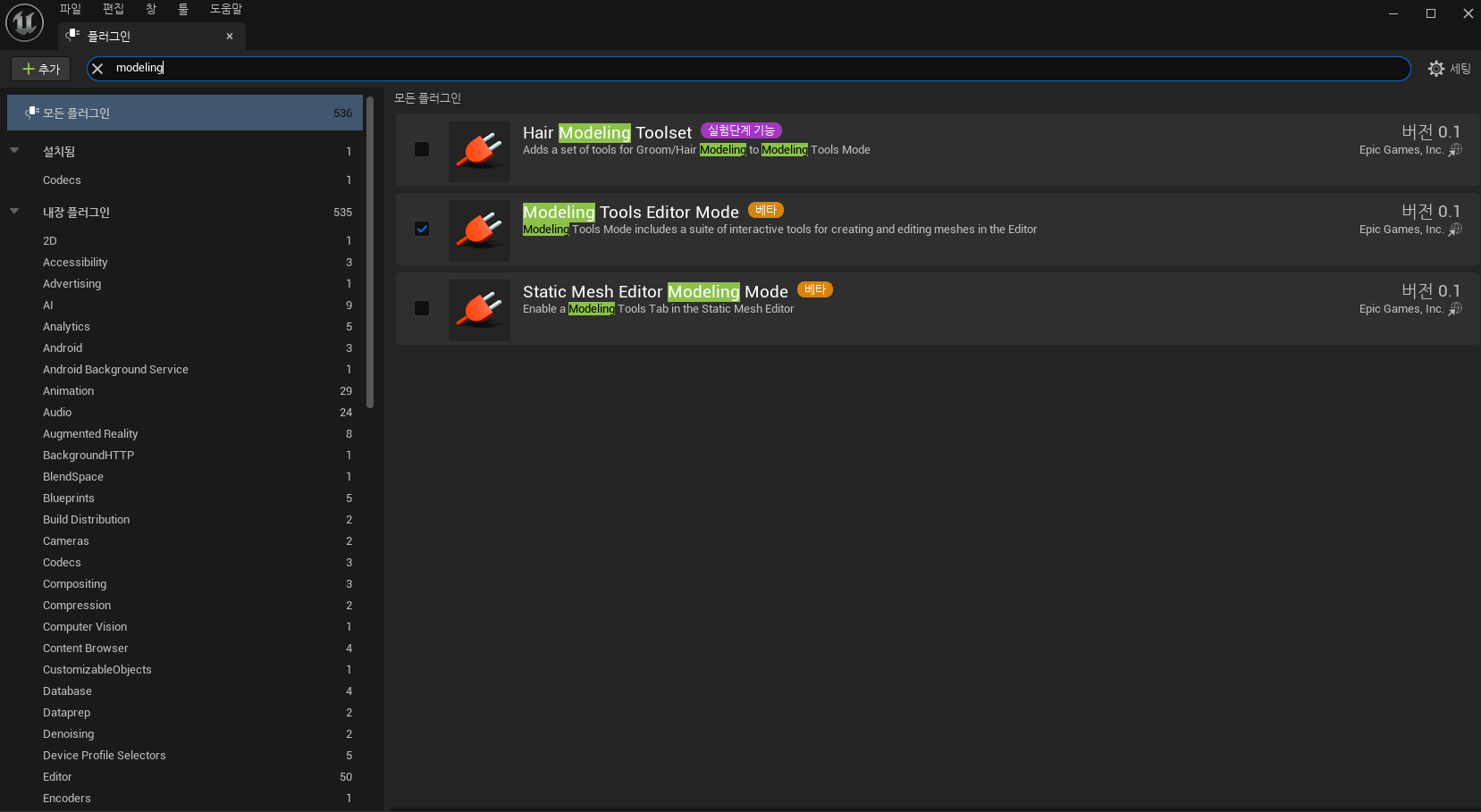'Modeling Tools Editor Mode'를 체크합니다. 만약 체크가 안되어 있다면 체크 후 언리얼 프로젝트를 재시작합니다.