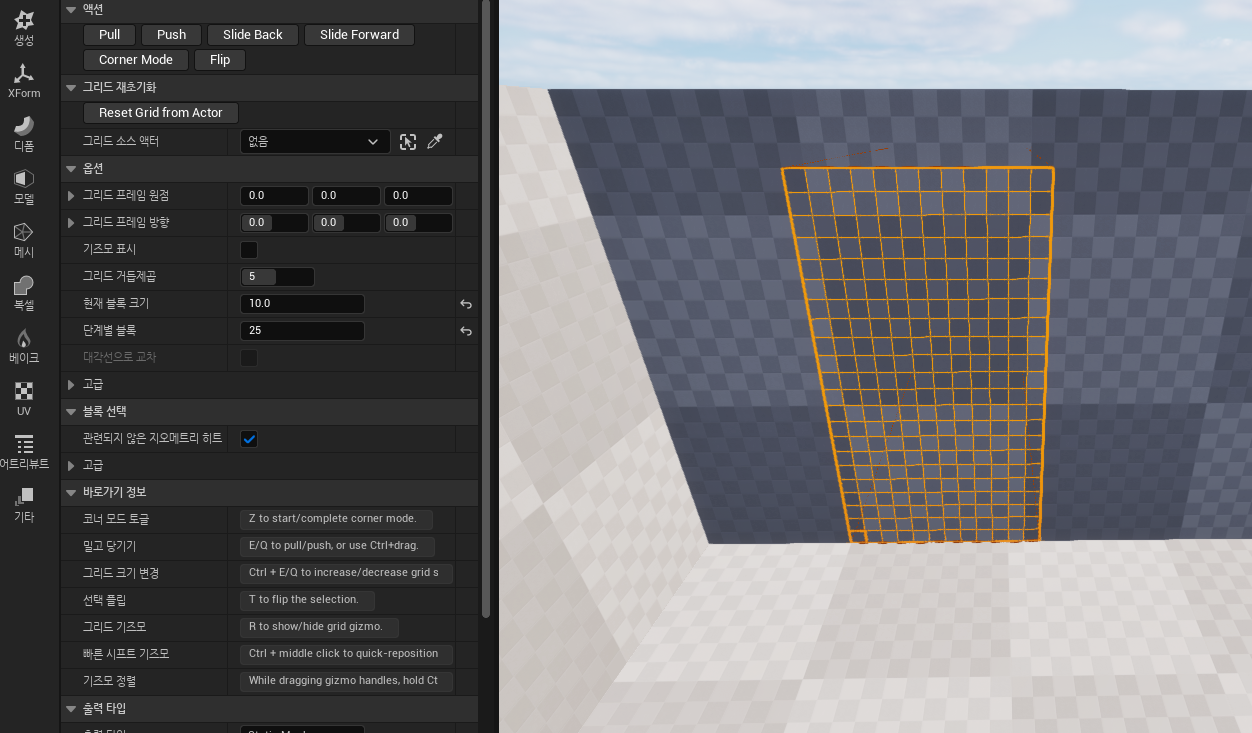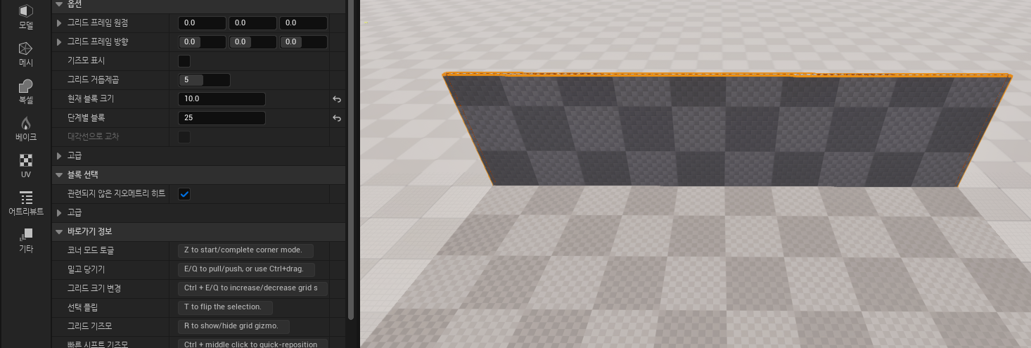 만들어진 바닥의 한 꼭지점을 클릭 한 후 반대편 꼭지점을 shift키를 누른 상태에서 클릭하면 직선상에 있는 모든것을 선택할 수 있습니다. 이 상태에서 "단계별 블록" 을 25으로 바꾼 후 "E"키를 눌러봅니다.
