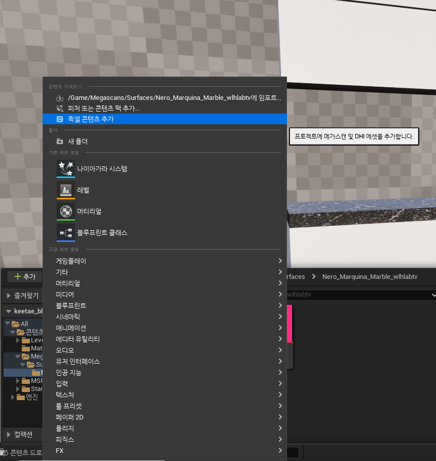 퀵셀 콘텐츠 추가를 눌러 바닥재와 벽재를 찾겠습니다.