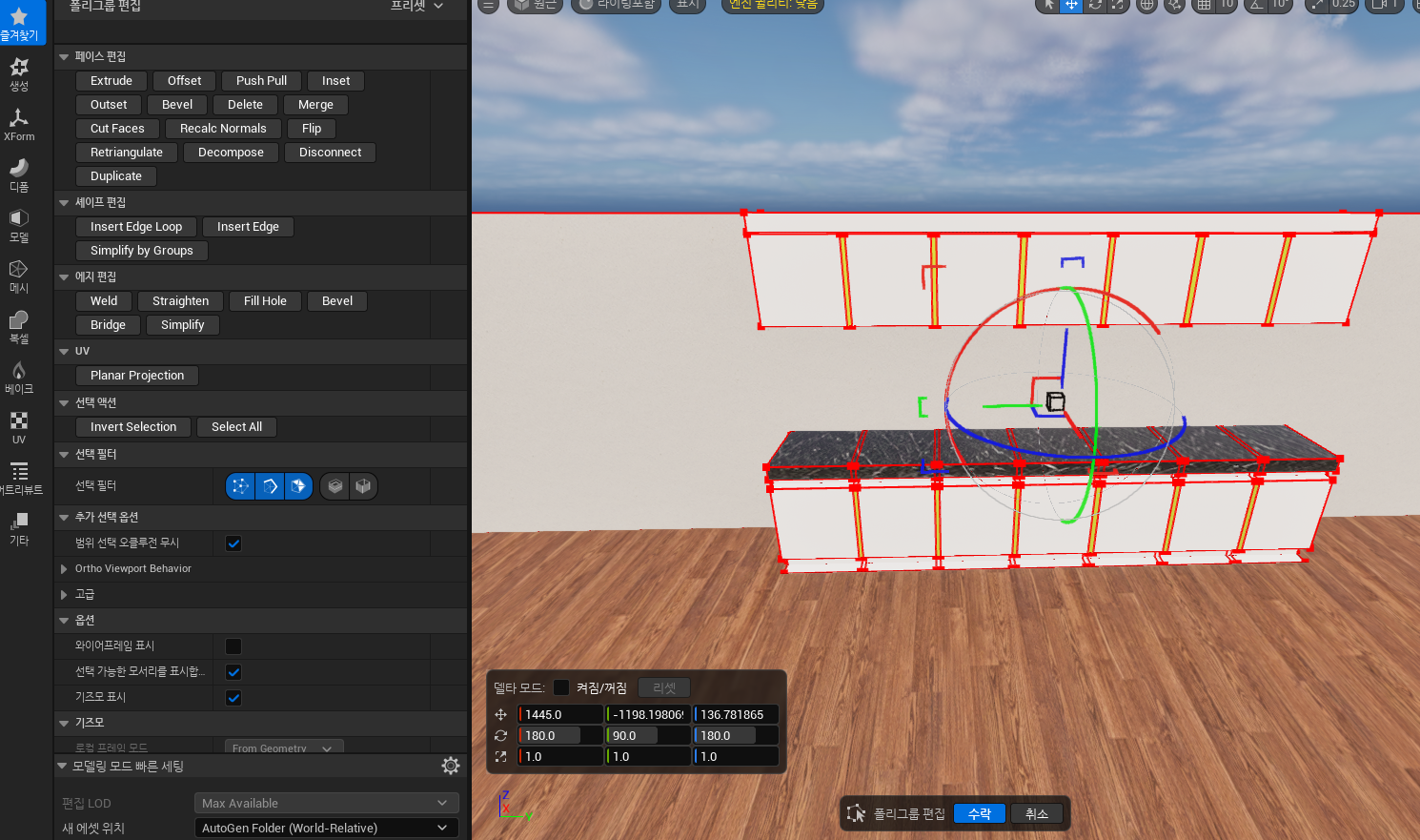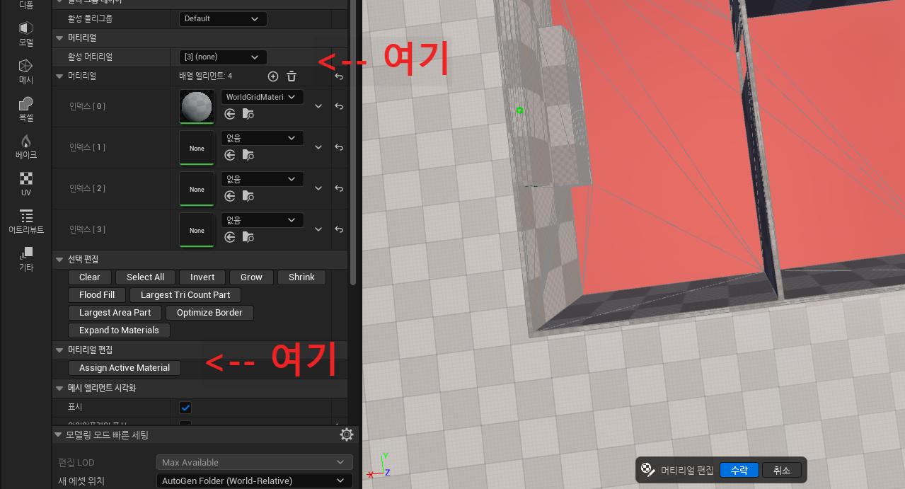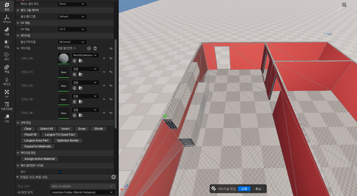 다음으로 모델링 모드 > Material Edit을 눌러 바닥과 벽을 분리한 후 다운로드한 머터리얼을 적용시키겠습니다.