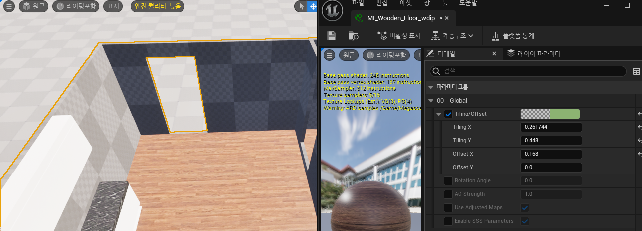 바닥에 적용 후 머터리얼 인스턴스를 더블클릭 해 Tiling X, Y를 조절해 원하는 모양으로 만듭니다.