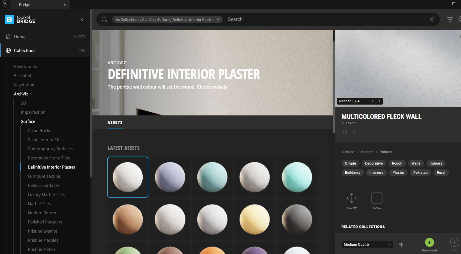 그리고 Collections > Archviz > Surface에서 Wooden Floor와 Multicolored Fleck Wall을 찾아