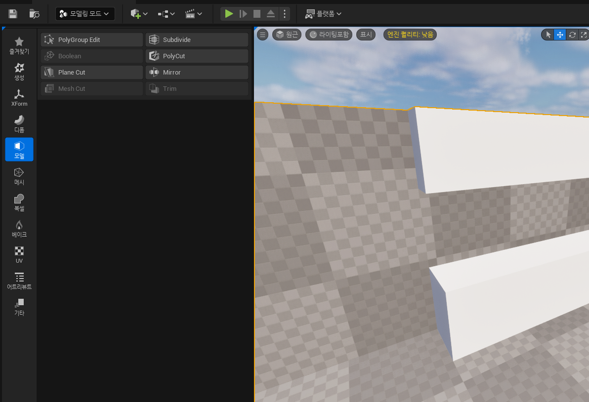 오늘은 지난 강의에 이어서 싱크대를 좀 더 현실감 있게 만들겠습니다. 1. 만든 싱크대를 목적에 맞게 쪼개보겠습니다. 모델링모드를 활성화한 후 싱크대를 클릭한 상태에서 모델탭의 'PolyGroup Edit'를 클릭합니다. 그리고 'Insert Edge Loop' 를 클릭합니다. 그다음 마우스를 하부장 왼쪽 모서리에 가져다 대면 초록색 선이 생기는 것을 확인할 수 있습니다. 돌상판을 만들기위해 아래 그림과 같은 부분에서 클릭해 하부장을 나눠줍니다. 성공하셨다면 아래와 같은 그림으로 변경됩니다. 이와 같은 방법으로 하부장의 걸레받이와 상부장의 몰딩 부분을 나누어 주겠습니다. 잘 나누어 주셨으면 왼쪽 윗부분 'Done' 버튼을 눌러 상태를 저장합니다. 싱크대의 현실감을 더하기 위해 하부장의 걸레받이 부분을 조..